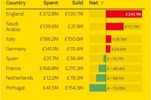 1、英格蘭:支出3.728億;賣(mài)出1.307億;凈支出2.421億