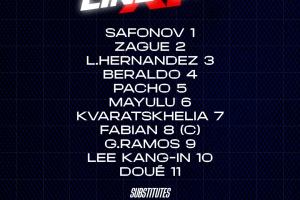39-薩福諾夫、42-扎格、21-盧卡斯-埃爾南德斯、35-貝拉爾多、51-帕喬、24-馬尤盧、7-克瓦拉茨赫利亞、8-法比安-魯伊斯、9-貢薩洛-拉莫斯、19-李剛?cè)省?4-杜埃