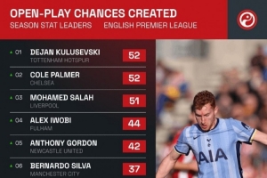 本賽季英超運(yùn)動戰(zhàn)創(chuàng)造機(jī)會榜: