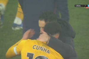 比賽結(jié)束之后,曼聯(lián)主帥阿莫林與庫尼亞這位狼隊(duì)前鋒擁抱耳語。