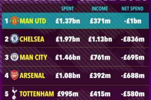 2、切爾西:支出19.7億;收入11.3億;凈支出8.36億