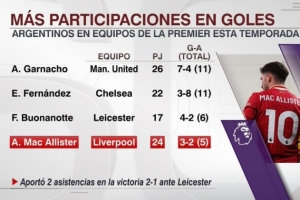 本賽季英超阿根廷球員參與進(jìn)球榜(所有賽事):