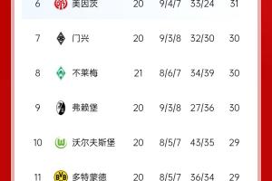 拜仁聯(lián)賽7連勝,先賽暫9分優(yōu)勢領(lǐng)跑。