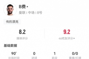 體育資訊2月8日訊 曼聯(lián)在本輪足總杯2-1絕殺萊斯特城,B費(fèi)本場(chǎng)數(shù)據(jù)如下: