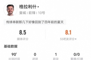 體育資訊2月8日訊 曼城在本輪足總杯2-1逆轉(zhuǎn)萊頓東方,格拉利什本場數(shù)據(jù)如下: