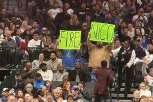 比賽中,一位球迷在唱歌環(huán)節(jié)吸引了鏡頭,在鏡頭給他之后,他迅速不唱了,明顯嘴型表示:“解雇尼科(哈里森,獨(dú)行俠經(jīng)理)”,隨后,這位球迷被保安驅(qū)逐(下圖)。