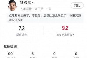 全場(chǎng)比賽顏駿凌貢獻(xiàn)數(shù)次撲救,還將大迫勇也的點(diǎn)球拒之門外,但仍無(wú)力幫助球隊(duì)扭轉(zhuǎn)頹勢(shì),賽后他獲得隊(duì)內(nèi)最高的7.2分。