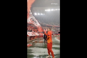 賽后泰山隊(duì)謝場(chǎng)的時(shí)候,卡扎爾接過球迷會(huì)的旗幟揮舞起來,并且與球迷互動(dòng)。