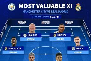 德轉(zhuǎn)曼城X皇馬最貴11人陣(單位:歐元):