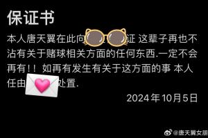 名為“唐天翼女朋友”的微博賬號再曝聊天記錄,唐天翼曾向這位女友做出“保證書”,保證這輩子再也不沾油管賭球相關(guān)的任何東西。