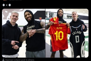 奧爾莫曬出和利拉德互換球衣、做對方經(jīng)典慶祝動作的照片,配文:??x??。