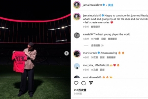 體育資訊2月15日訊 拜仁已經(jīng)官宣和穆西亞拉續(xù)約至2030年,球員本人也通過社媒曬照紀(jì)念。