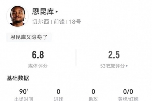 體育資訊2月15日訊 切爾西在本輪英超0-3不敵布萊頓,恩昆庫(kù)本場(chǎng)客串中鋒數(shù)據(jù)如下: