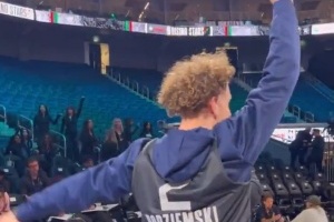 在球員訓(xùn)練時(shí),勇士隊(duì)小將波杰姆斯基在本方底線直接單臂甩球,皮球“聽話”地直接飛入對(duì)面籃筐,一旁的熱火球員小海梅全程目睹了這一情景。