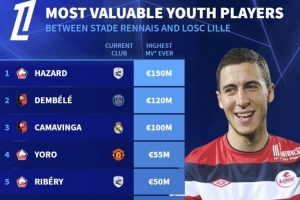 體育資訊2月17日訊 《轉(zhuǎn)會(huì)市場(chǎng)》統(tǒng)計(jì)了里爾和雷恩兩家俱樂(lè)部培養(yǎng)的青訓(xùn)球員歷史身價(jià)最貴榜單,阿扎爾居首。