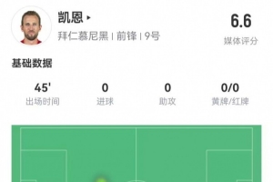 體育資訊2月19日訊 拜仁在本輪歐冠附加賽次回合對陣凱爾特人,凱恩本場數(shù)據(jù)如下: