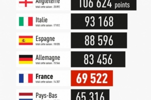 體育資訊2月19日訊 《隊報》撰文表示,摩納哥在歐冠淘汰賽出局對法國的歐足聯(lián)系數(shù)排名造成不利影響,法國目前以69.522分位居第五。