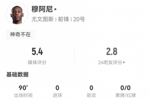 體育資訊2月20日訊 尤文在本輪歐冠次回合1-3被逆轉(zhuǎn)淘汰,穆阿尼本場(chǎng)數(shù)據(jù)如下: