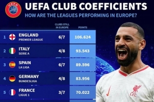 體育資訊2月22日訊 歐戰(zhàn)淘汰賽附加賽戰(zhàn)罷,歐足聯(lián)也更新了各大聯(lián)賽的五年歐戰(zhàn)積分情況,英超居首,意甲、西甲、德甲、法甲排名二到五位。
