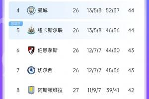 目前,英超第4曼城到英超第8維拉只有2分的分差。