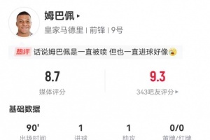 體育資訊12月23日訊 皇馬在本輪西甲4-2擊敗塞維利亞,姆巴佩本場(chǎng)數(shù)據(jù)如下: