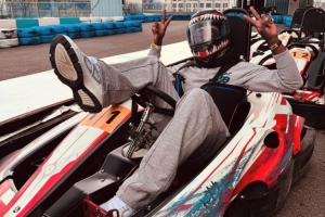照片中,戴著頭盔的小奧斯卡以各種pose與賽車合影,看上去心情非常不錯。