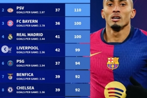 體育資訊2月26日訊 德轉(zhuǎn)盤點了本賽季歐洲前十聯(lián)賽球隊各項賽事進球榜,其中巴薩39場120球居首,以下為具體榜單: