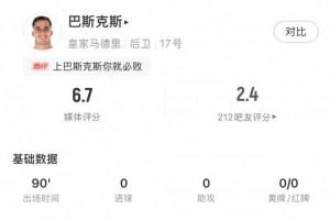 體育資訊3月2日訊 本輪西甲,貝蒂斯2-1戰(zhàn)勝皇馬。巴斯克斯本場數(shù)據(jù):