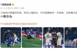 韓佳奇在個(gè)人微博中寫道:不是我們想要的結(jié)果。收拾心情回京,為世預(yù)賽做好一切準(zhǔn)備,也盼著月底回到工體????????