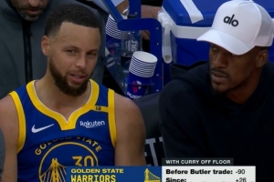 比賽中,轉(zhuǎn)播方曬出數(shù)據(jù):在巴特勒到來之前,庫里下場(chǎng)時(shí)球隊(duì)的正負(fù)值為-90;