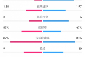 下一篇: 占優(yōu)!皇馬2-1馬競?cè)珗鰯?shù)據(jù):射門13-6,射正7-2,控球率51%-49%