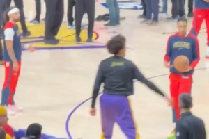 賽前熱身環(huán)節(jié),湖人中鋒海斯跑動(dòng)鵜鶘陣中,和前隊(duì)友們攀談幾句后跑了回去。