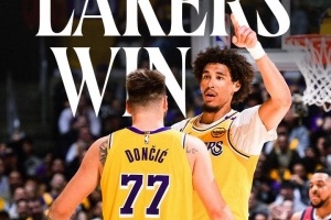 賽后,湖人官方曬出贏球海報,喂餅-吃餅組合東契奇和海斯登上封面。