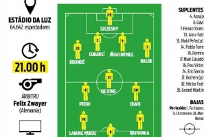 體育資訊3月5日訊 巴薩將在今晚的歐冠1/8決賽首回合客場(chǎng)對(duì)陣本菲卡,《每日體育報(bào)》則對(duì)巴薩首發(fā)進(jìn)行了預(yù)測(cè),其中中場(chǎng)三人組將是奧爾莫、德容和佩德里。