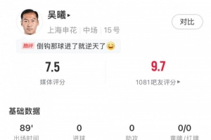 體育資訊3月5日訊 今晚進(jìn)行的亞冠精英聯(lián)賽1/8決賽首回合比賽,上海申花主場(chǎng)1-0擊敗川崎前鋒。本場(chǎng)比賽,幾乎打滿全場(chǎng)的老將吳曦依舊發(fā)揮穩(wěn)健。
