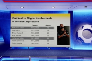 體育資訊12月30日訊 英超第19輪比賽,薩拉赫1射2傳,幫助利物浦客場(chǎng)5-0擊敗西漢姆。據(jù)BBC統(tǒng)計(jì),薩拉赫本賽季出戰(zhàn)18場(chǎng)英超比賽,打進(jìn)17球,送出13記助攻,成為英超歷史單賽季參與30球最快的球員。