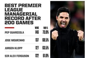 阿爾特塔的英超200場勝率是59.3%,在英超歷史中位列第五位。