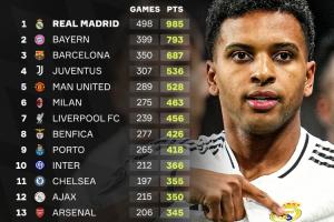 體育資訊03月08日訊 在OneFootball公布的歐冠歷史積分榜上,皇馬以498場比賽積985分的成績高居榜首,拜仁399場積793分排在第二位,巴薩350場比賽687分位列第三。