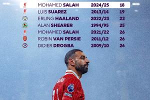 根據(jù)英超官方的統(tǒng)計(jì),薩拉赫是英超單賽季達(dá)成參與30球所有場(chǎng)次最少的球員,在他身后是2013/14賽季的蘇亞雷斯,用時(shí)19場(chǎng),再往后是哈蘭德、希勒和薩拉赫自己。