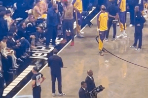 本場比賽因傷缺陣的詹姆斯到場觀賽。