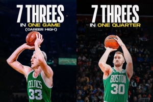 在今天凱爾特人114-108戰(zhàn)勝爵士的比賽中,豪澤全場命中9記三分,其中第三節(jié)便命中7記三分,只用一節(jié)就追平了綠軍名宿伯德的生涯單場三分命中紀錄。