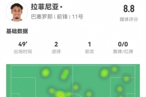 體育資訊3月12日訊 巴薩在本輪歐冠半場3-1領(lǐng)先本菲卡,拉菲尼亞數(shù)據(jù)如下: