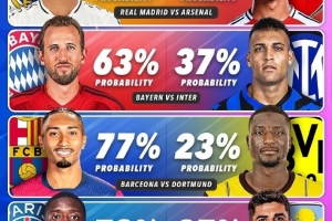 體育資訊3月13日訊 歐冠1/4決賽賽程出爐后,外媒Score90也公布了各隊(duì)晉級(jí)概率和奪冠概率。