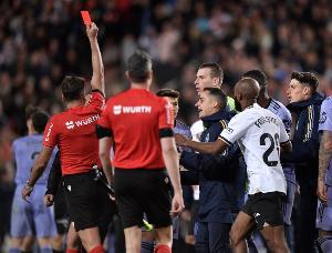 在2024年3月,皇馬2-2戰(zhàn)平瓦倫西亞最后時(shí)刻,貝林厄姆破門(mén),但主裁提前吹響終場(chǎng)哨?;蜀R集體抗議,貝林厄姆對(duì)裁判出言不遜,被主裁判希爾-曼薩諾直紅罰下。