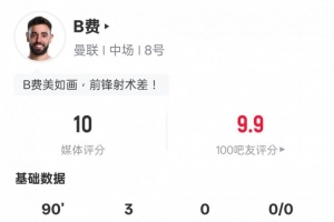 體育資訊3月14日訊 歐聯(lián)杯1/8決賽次回合,曼聯(lián)主場4-1戰(zhàn)勝皇家社會,總比分5-2晉級八強。B費本場比賽首發(fā)出戰(zhàn),上演帽子戲法,送出4次關(guān)鍵傳球,盡管22次丟失球權(quán)全場最多,但仍獲評10分。