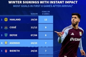 體育資訊3月15日訊 阿森西奧在冬窗加盟維拉后表現搶眼,各項賽事8場打進7球,數據統(tǒng)計顯示這也并列五大聯賽新世紀冬窗新援同期進球榜第4位。