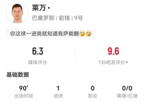 體育資訊3月17日訊 巴薩在本輪西甲4-2逆轉(zhuǎn)馬競(jìng),萊萬(wàn)本場(chǎng)數(shù)據(jù)如下: