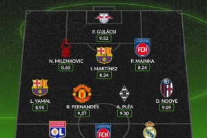 中場:亞馬爾(巴薩,8.95分)、B費(曼聯(lián),9.37分)、普萊亞(門興,9.30分)、恩多耶(博洛尼亞,9.09分)