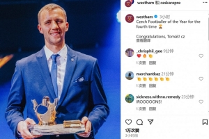 西漢姆官方賬號(hào)也轉(zhuǎn)發(fā)了該消息,并配文:“第4次當(dāng)選捷克足球先生。祝賀你,紹切克!”