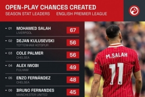 本賽季英超運動戰(zhàn)創(chuàng)造機會榜: